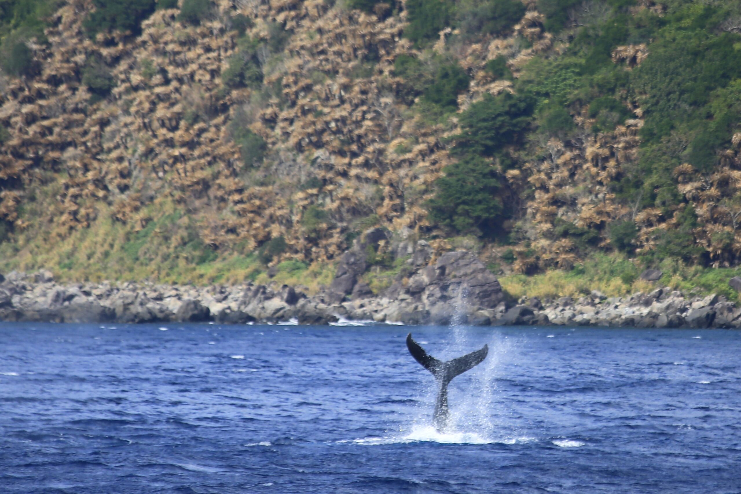 時化模様!クジラを見てる船より、先でブローが上がってるよ!と